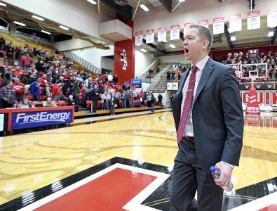 The third-year Youngstown State University men’s basketball coach started pumping his fist on the embossed Y on the Beeghly Center floor at center court.