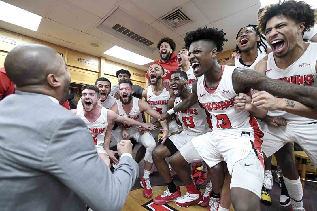 - Correspondent photo / Robert Hayes The Penguins celebrate with Coach Jason Slay (left) after their 88-70 rout of first-place Wright State.