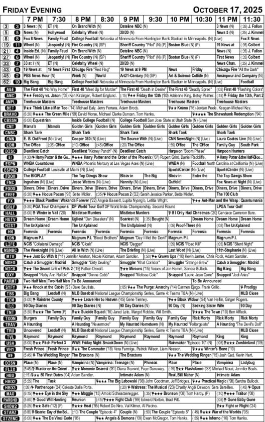 Friday night TV listings Friday night TV listings NewsletterToday's breaking news and more in your inboxEmail(Required) I'm interested in (please check all that apply)(Required) Daily Newsletter Breaking News Obituaries Are you a paying subscriber to the newspaper?(Required) Yes No